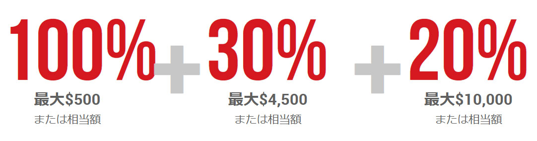 入金ボーナスは最大$500まで100%、最大$4,500まで30%、最大総計額$15,000まで20%の3段階式ボーナスです。